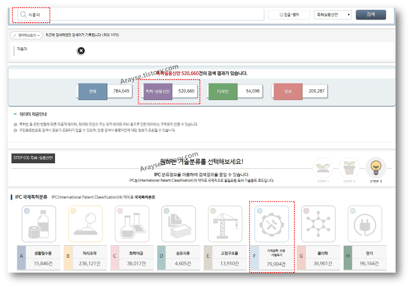 예를 들어 자동차를 입력하면 해당되는 특허 분류가 나오고 각각의 분류된 항목을 클릭하게 되면